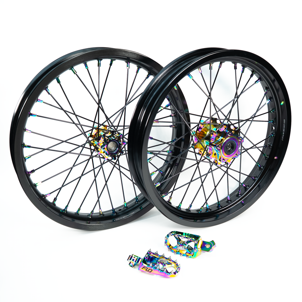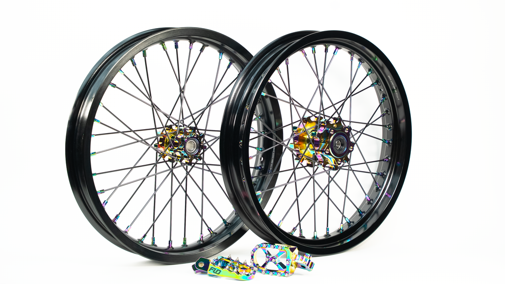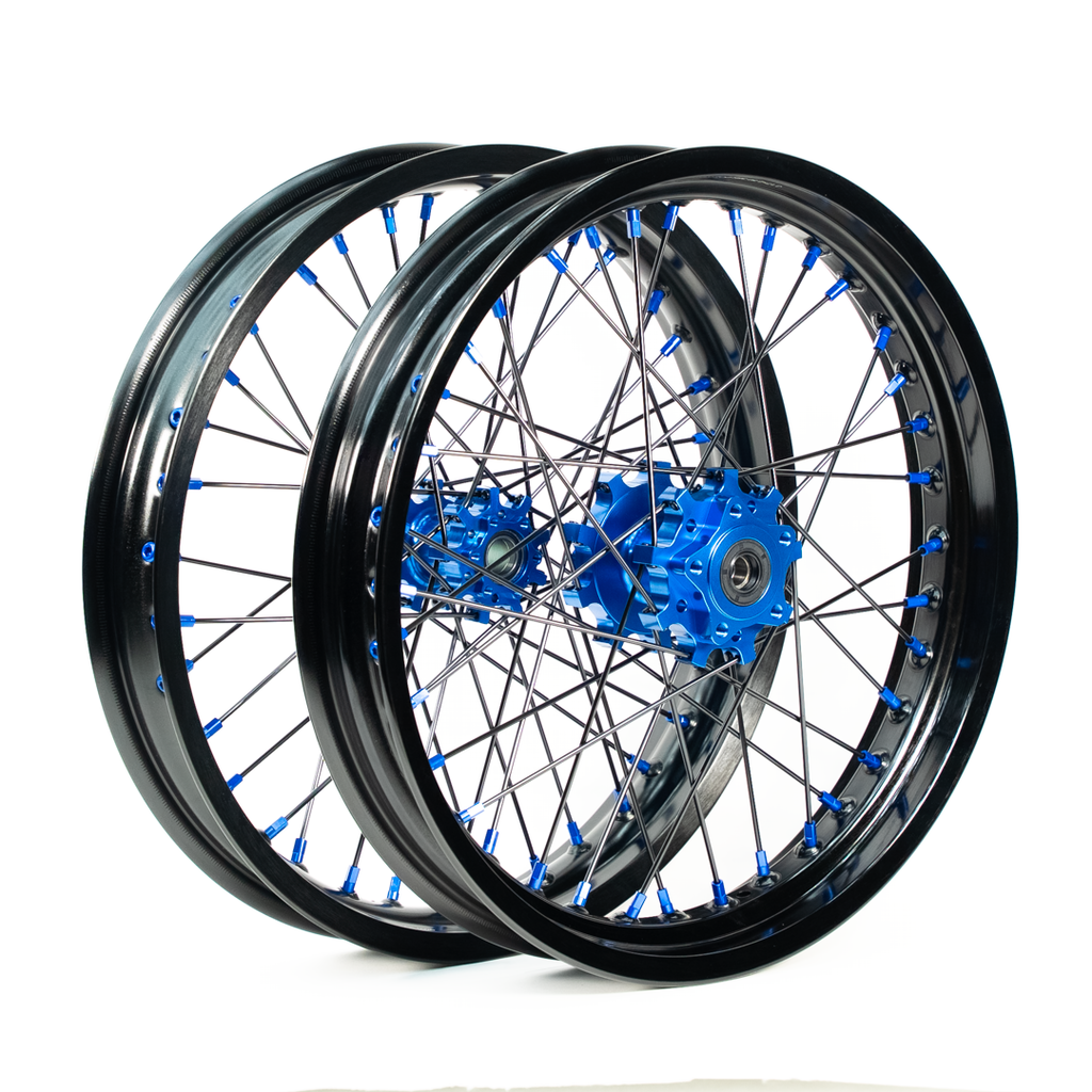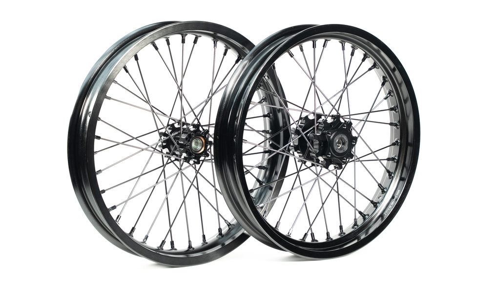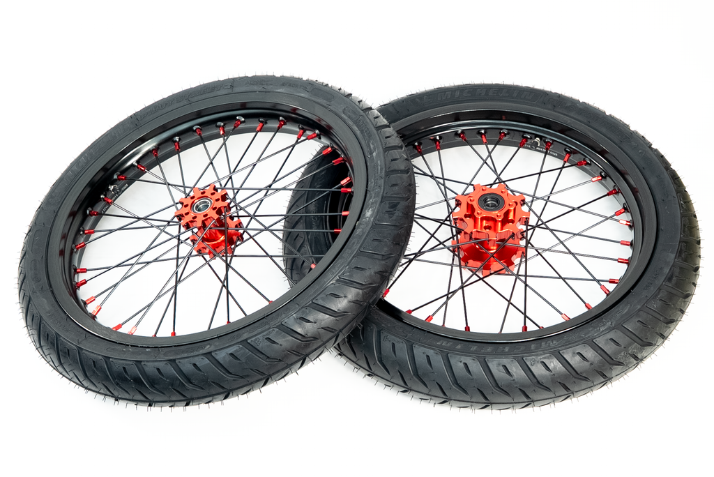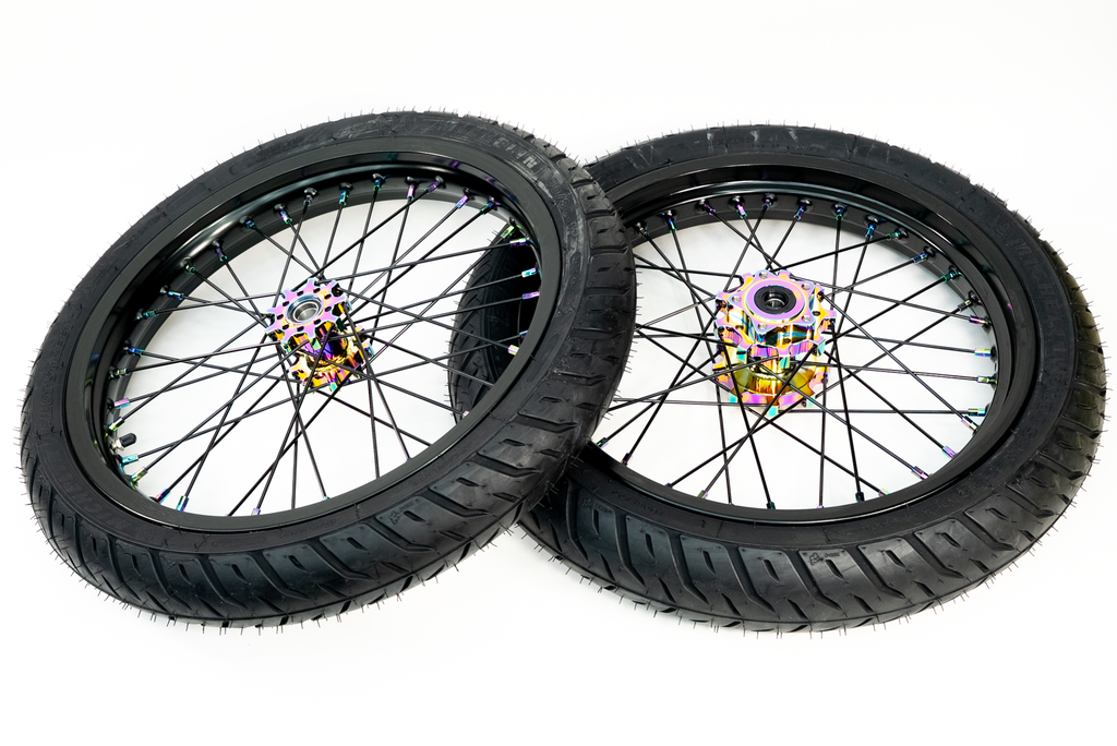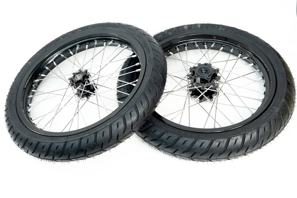 If you are looking for the ultimate 17" supermoto wheelset with the best tires in the market, look no further. Designed for the widest supermoto tires that will fit on the Surron Light Bee / E Ride Pro 2.0 without rubbing (90/80-17 Front and 100/80-17 Rear)