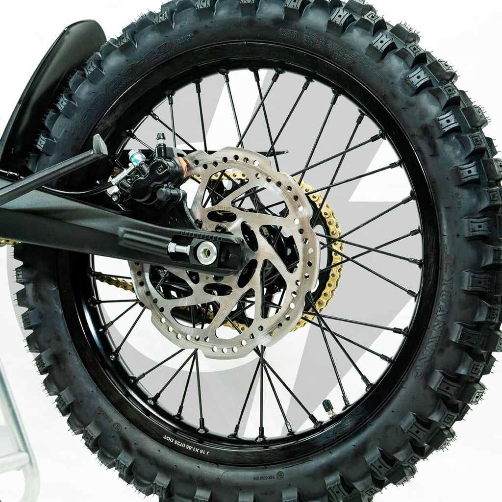 - Upgraded Surron Ultra Bee-style DOT moto brakes with 240mm x 3mm rotors