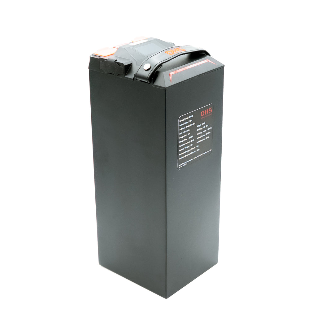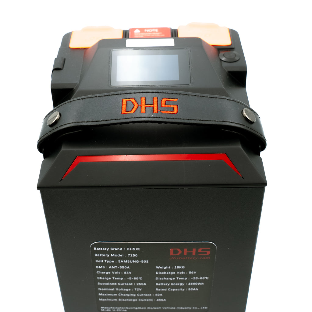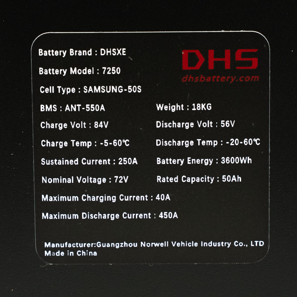 The DHS GT is a mid-sized 72v battery that combines speed, power, and range. It is the same 72v 50ah battery that powers the 28kw Ventus One. Our version has the side logos removed for a cleaner look.