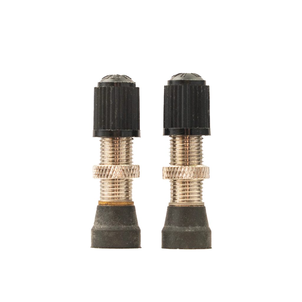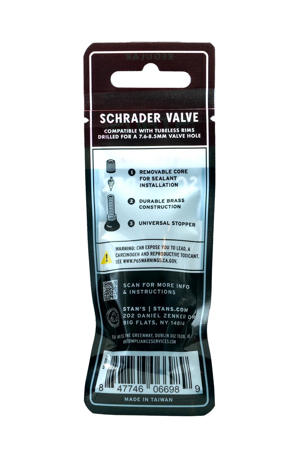 Brass tubeless Schrader valve compatible with tubeless rims drilled with a 7.5-8.5mm valve hole. Features a removable valve core for sealant injection and universal stopper to provide a reliable seal on most rim shapes.